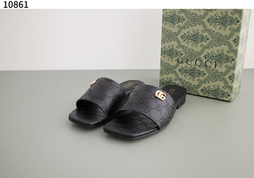 [GUCCI] 블랙 GG 레더 여성 더블 G 슬라이드 샌들