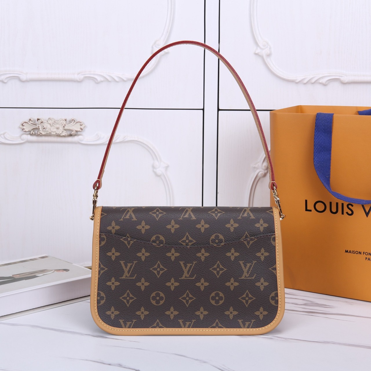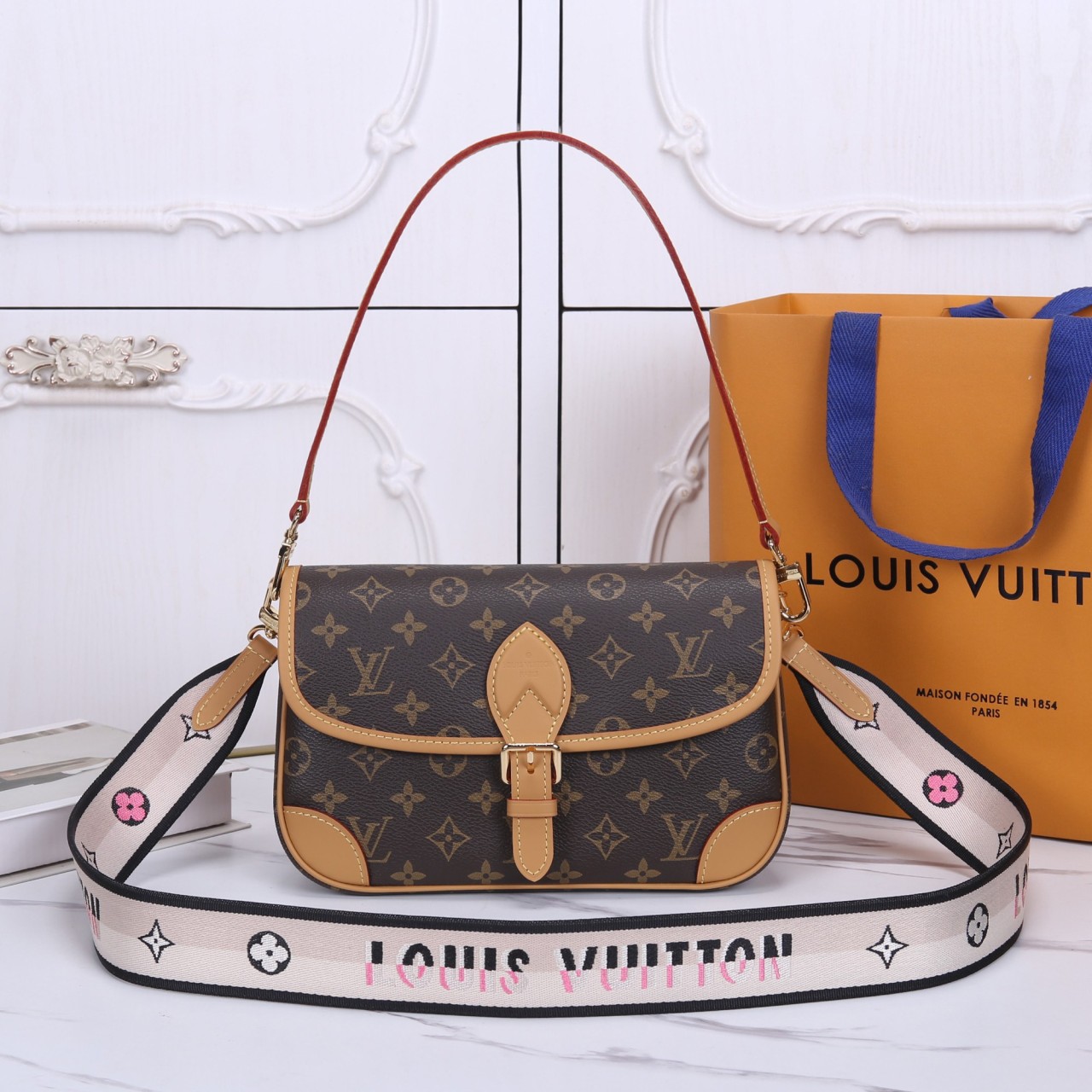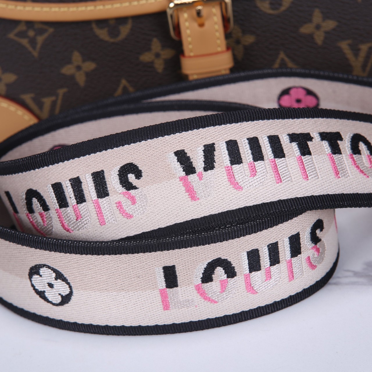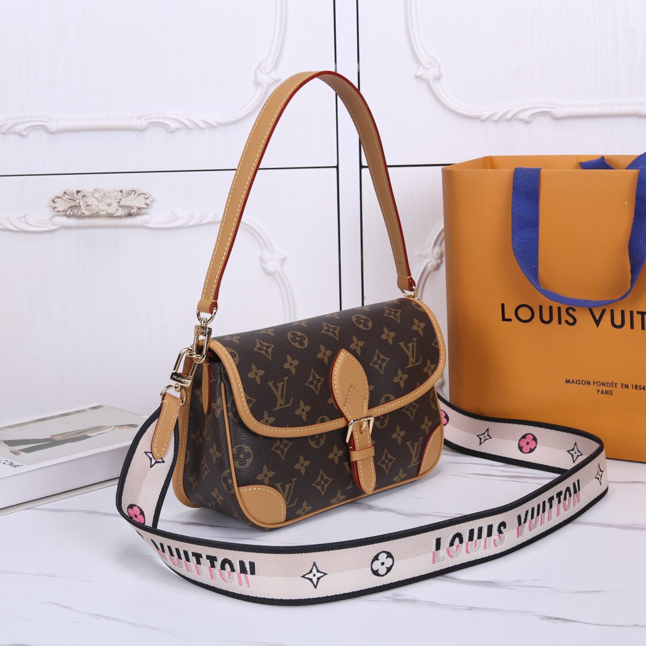 모노그램 캔버스 소재의 클래식한 숄더 플랩 백입니다. 유연한 바디와 천연 카우하이드 가죽 트리밍, 그리고 중앙의 버클 디테일이 특징입니다. 탈착 가능한 두 가지 스트랩(가죽 숄더 스트랩, 웨빙 크로스 바디 스트랩)이 제공되어 다양한 스타일 연출이 가능하며, 실용적이고 우아한 데일리 백입니다.