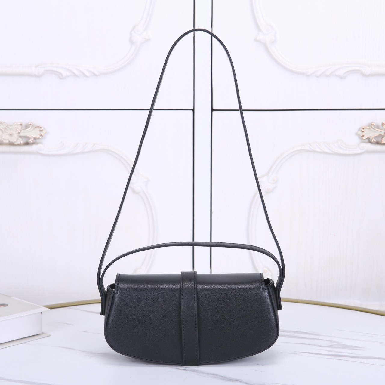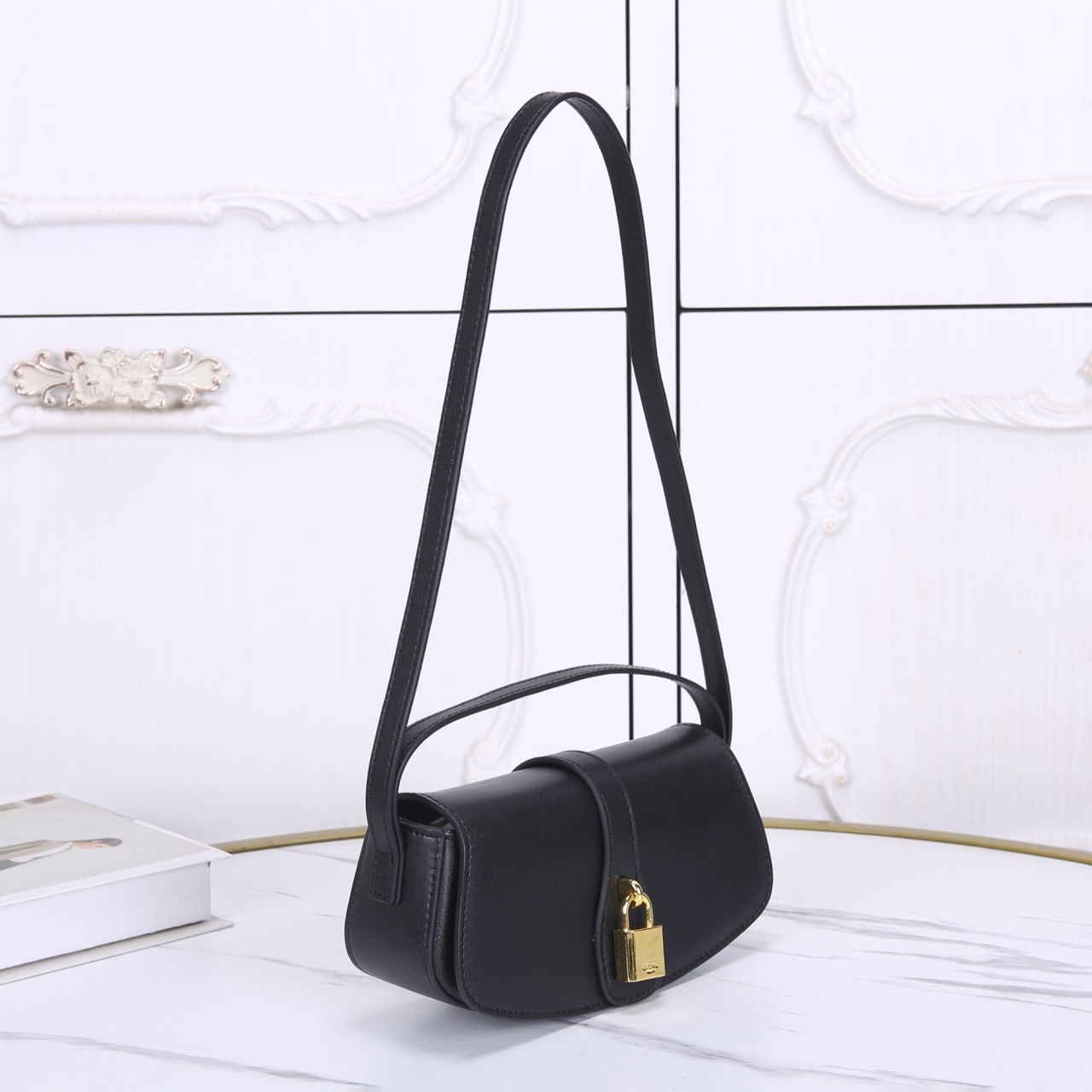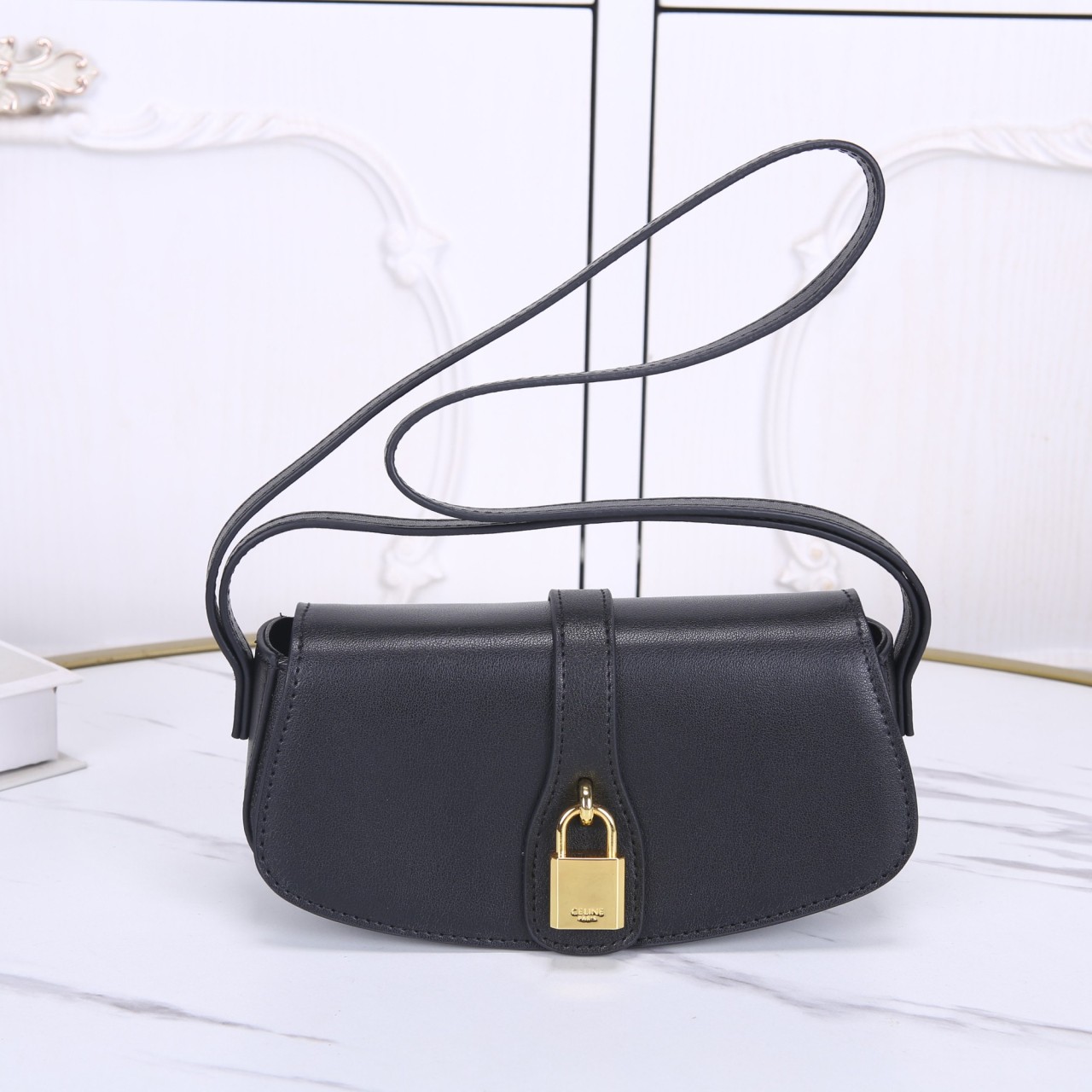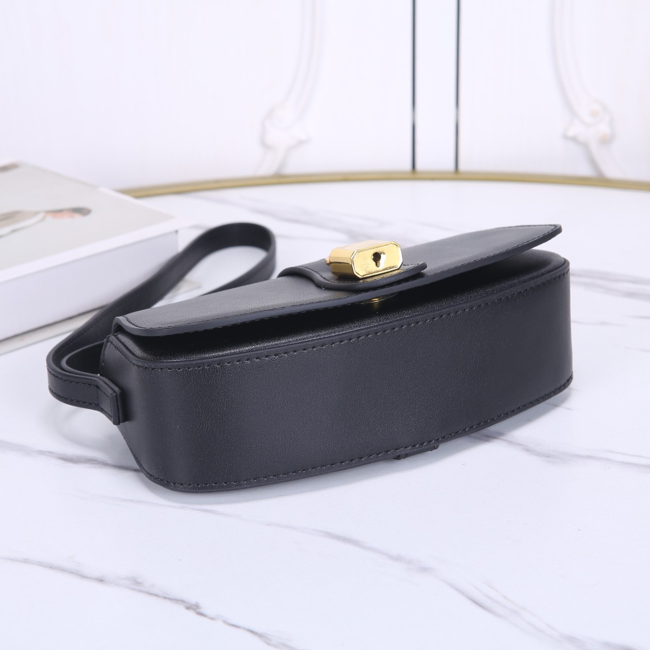 깔끔한 블랙 스무스 카프스킨 소재의 미니 플랩 숄더백입니다. 곡선형 바디와 전면의 골드 톤 자물쇠 잠금장치가 클래식하면서도 우아한 매력을 선사합니다. 숄더 스트랩은 길이 조절이 가능하여 숄더백이나 크로스 바디로 연출하기 좋고, 간결한 디자인으로 데일리 포인트 백으로 활용됩니다.