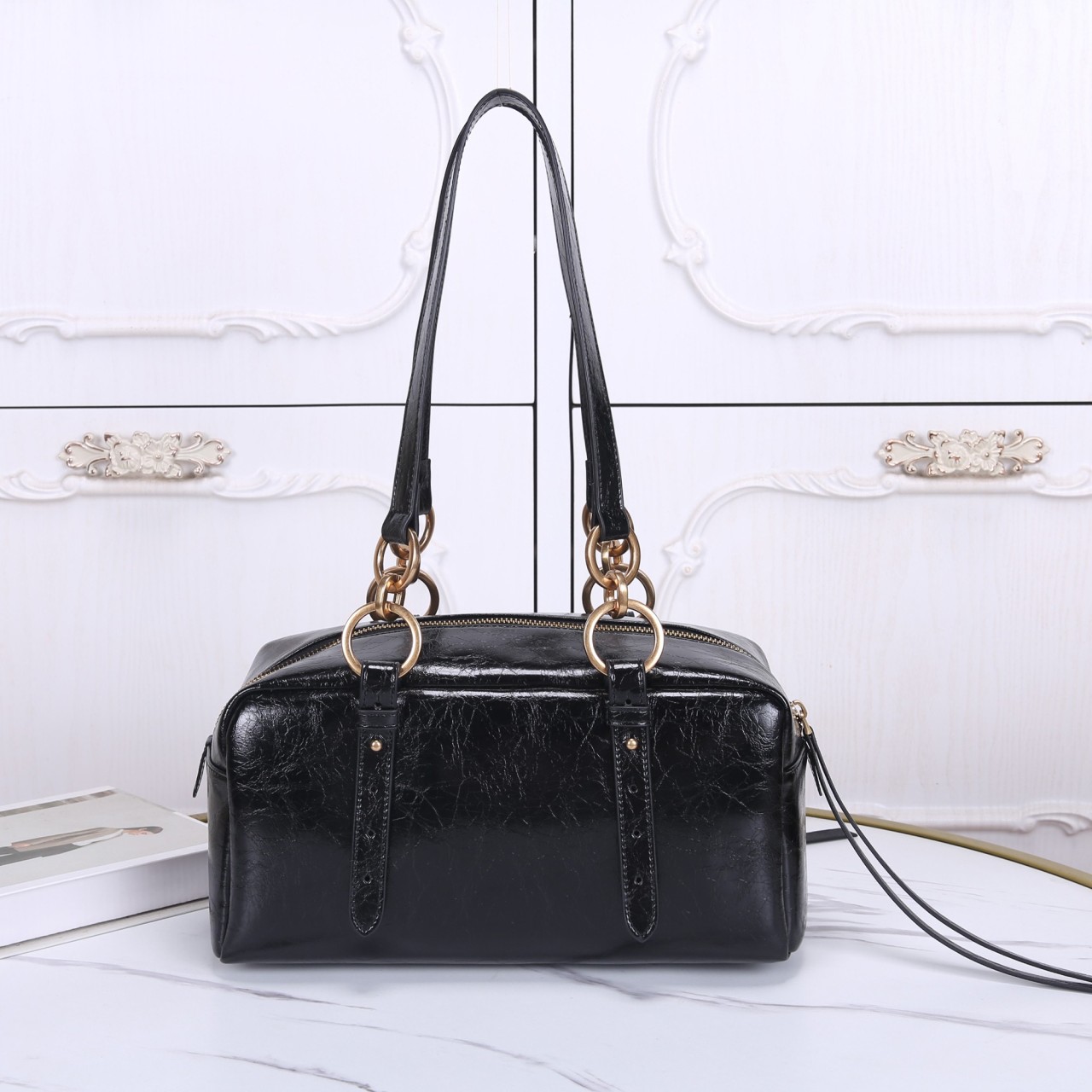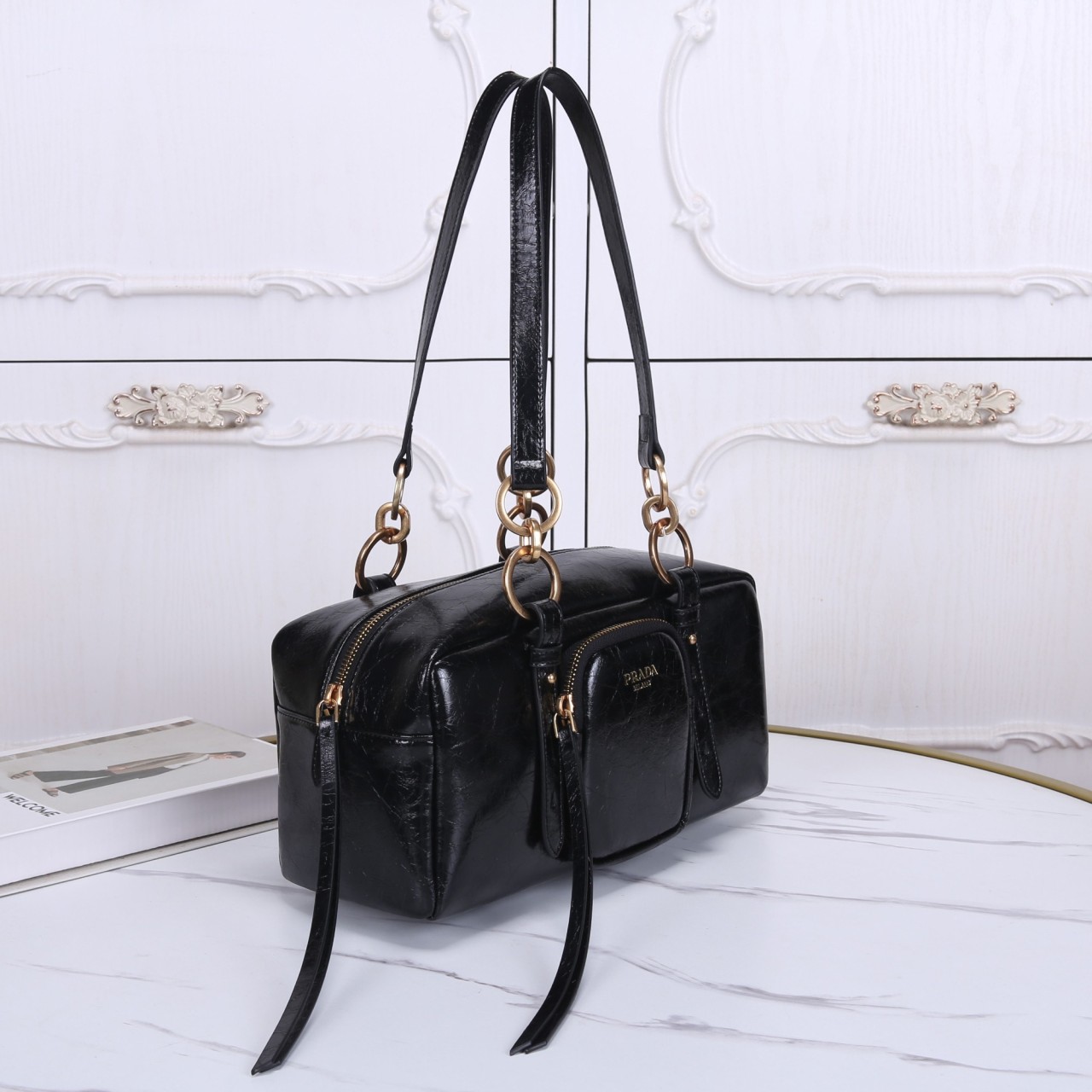 광택감 있는 블랙 빈티지 레더 소재의 컴팩트 호보백입니다. 숄더 스트랩 연결부에 골드 톤 O-링 디테일이 특징이며, 전면에 지퍼 포켓과 프라다 밀라노 로고가 장식되어 있습니다. 실용적인 사이즈와 유니크한 소재감으로 트렌디하면서도 시크한 분위기를 연출하는 데일리 숄더백입니다.
