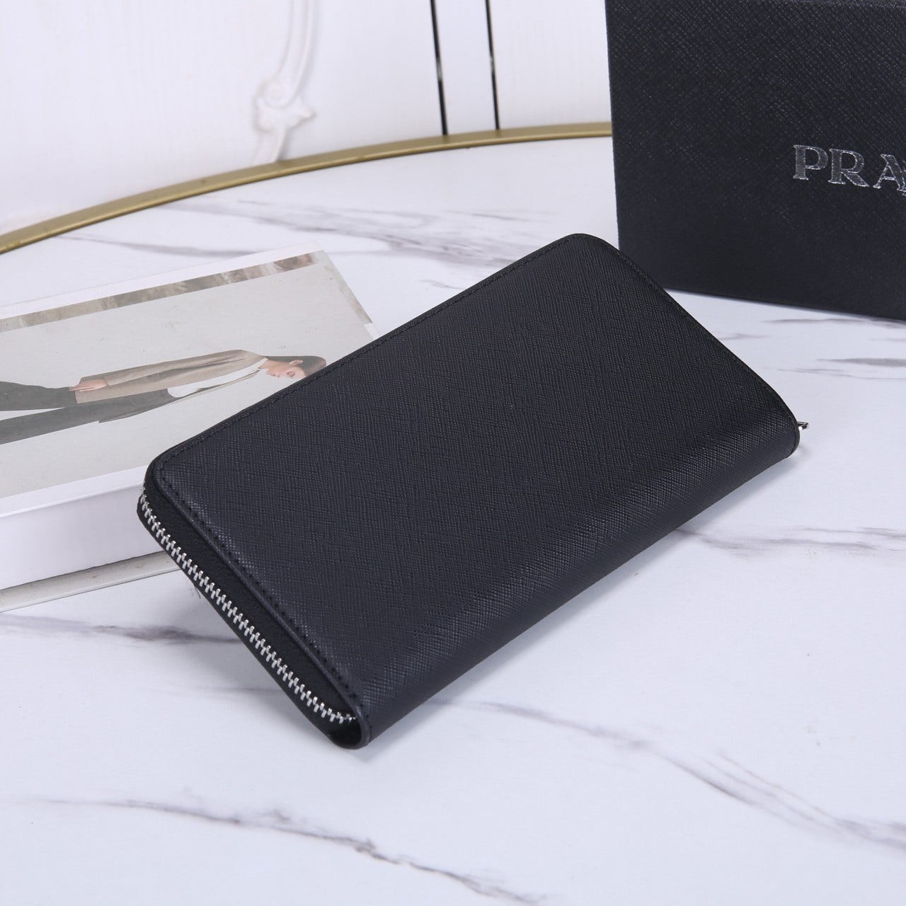 프라다의 클래식 소재와 디자인이 결합된 라운드 지퍼형 장지갑입니다.