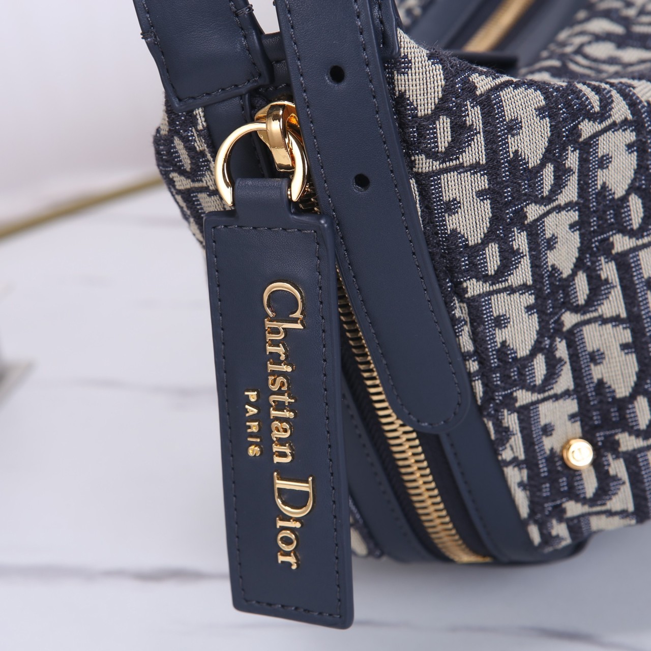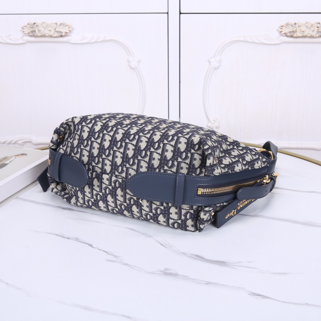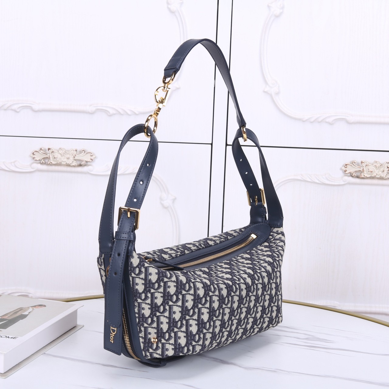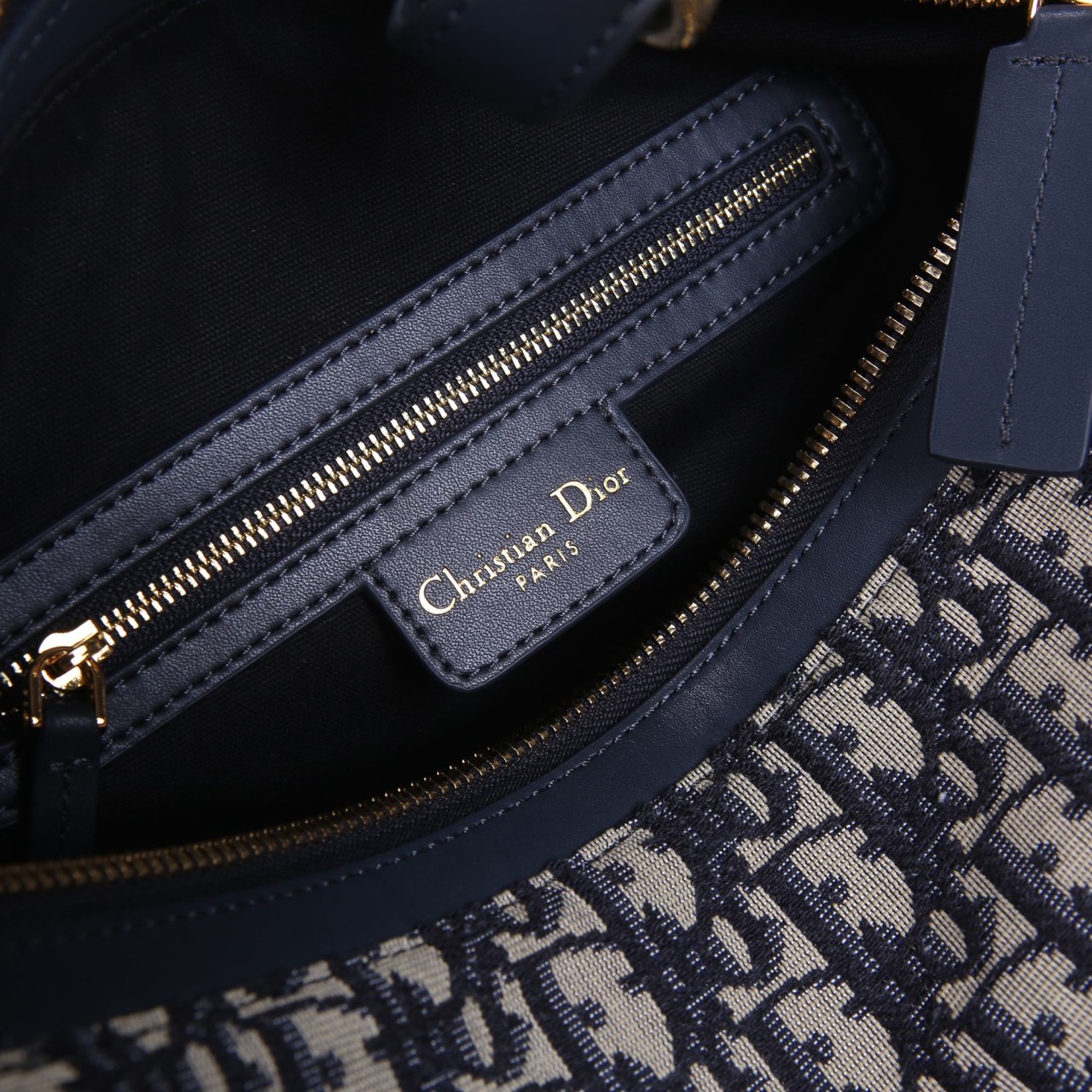 블루 디올 오블리크 자수 캔버스와 블루 송아지 가죽이 어우러진 바비 백입니다. 곡선형 실루엣과 밀리터리 스타일의 'CD' 버클, 그리고 뒷면의 '30 Montaigne' 시그니처가 특징입니다. 탈착 가능한 가죽 스트랩이 제공되어 숄더 또는 크로스 바디로 연출하기 좋은 우아한 호보 스타일 백입니다.
