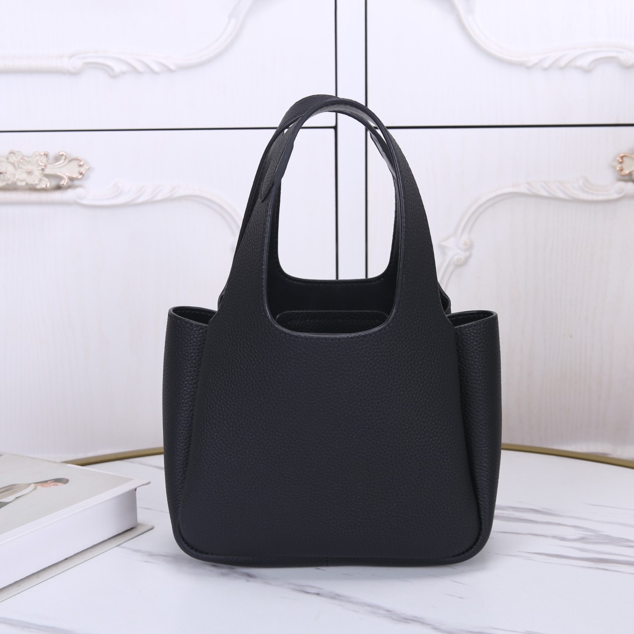 블랙 비텔로 다이노 가죽 소재의 미니 사이즈 토트백입니다. 심플하고 미니멀한 디자인에 전면의 실버 톤 트라이앵글 로고가 섬세한 포인트를 주며, 두 개의 핸들 구멍 디자인과 넉넉한 내부 수납공간이 특징입니다. 간결한 실루엣으로 데일리 룩에 활용하기 좋은 세련된 백입니다.