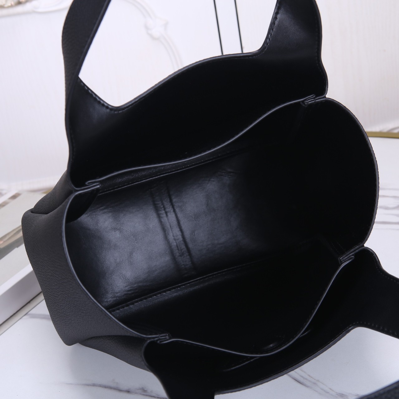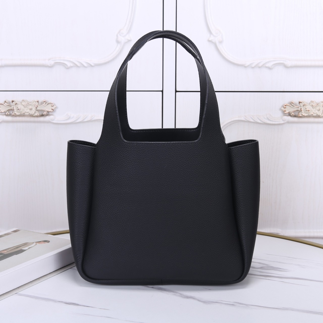블랙 비텔로 피닉스 가죽 소재의 미니멀한 토트백입니다. 깔끔하고 견고한 디자인에 전면의 실버 톤 트라이앵글 로고가 세련된 포인트를 주며, 넉넉한 수납력과 간결한 실루엣으로 데일리 룩부터 오피스 룩까지 다양하게 활용 가능한 모던한 디자인의 백입니다.