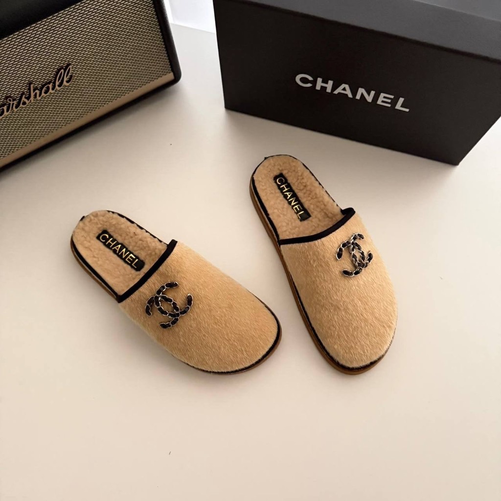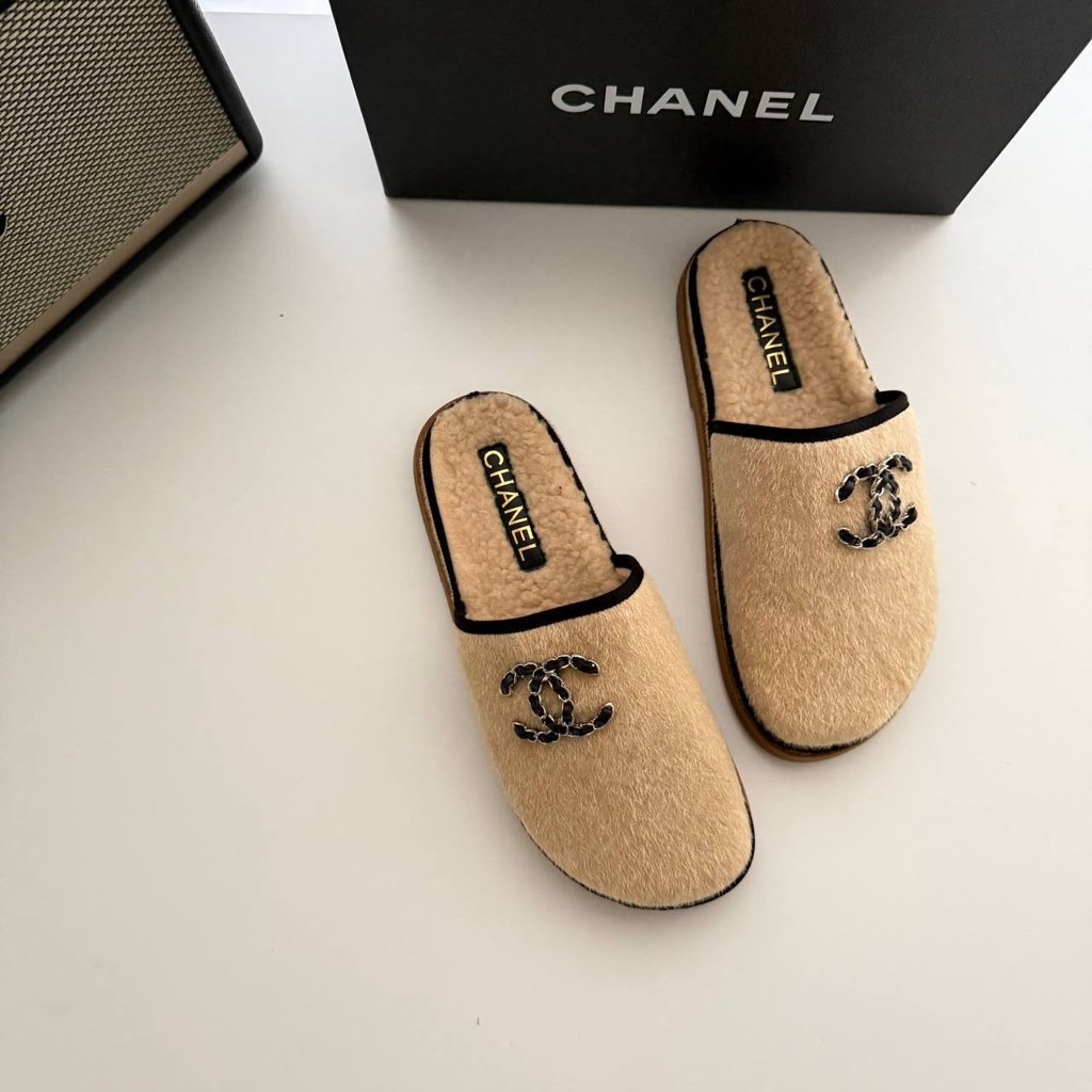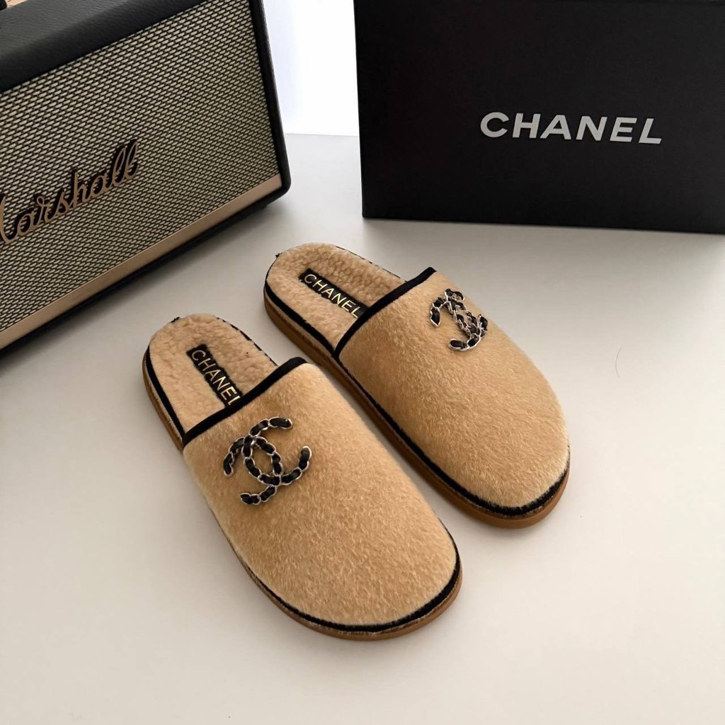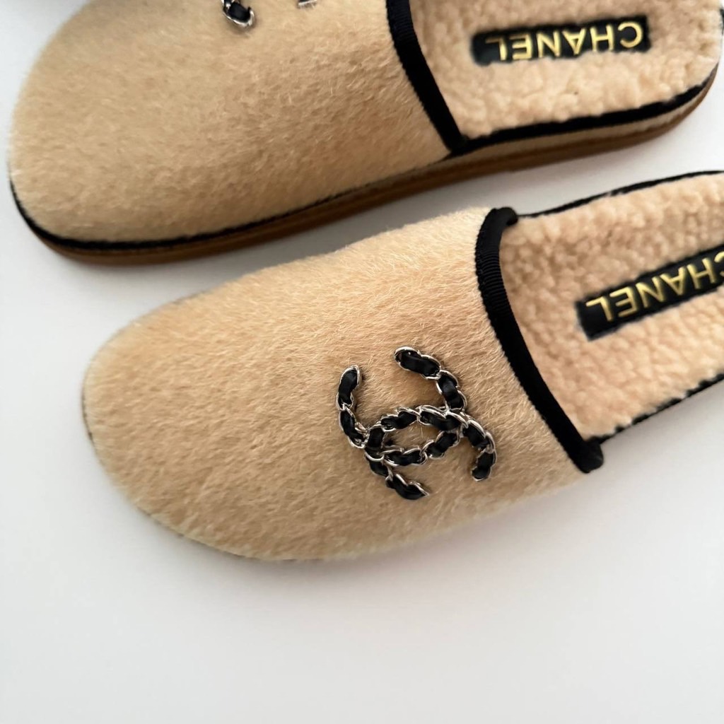 샤넬 체인 CC 로고 시어링 스웨이드 뮬 슬리퍼