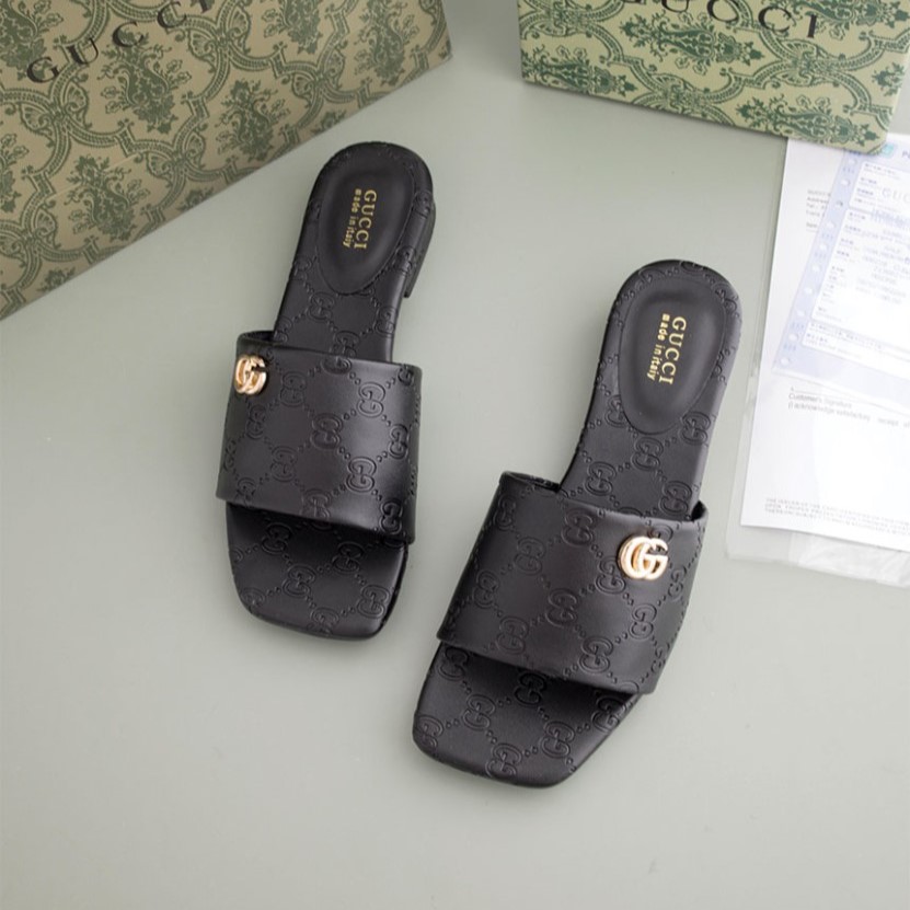 구찌 블랙 GG 레더 여성 더블 G 슬라이드 샌들