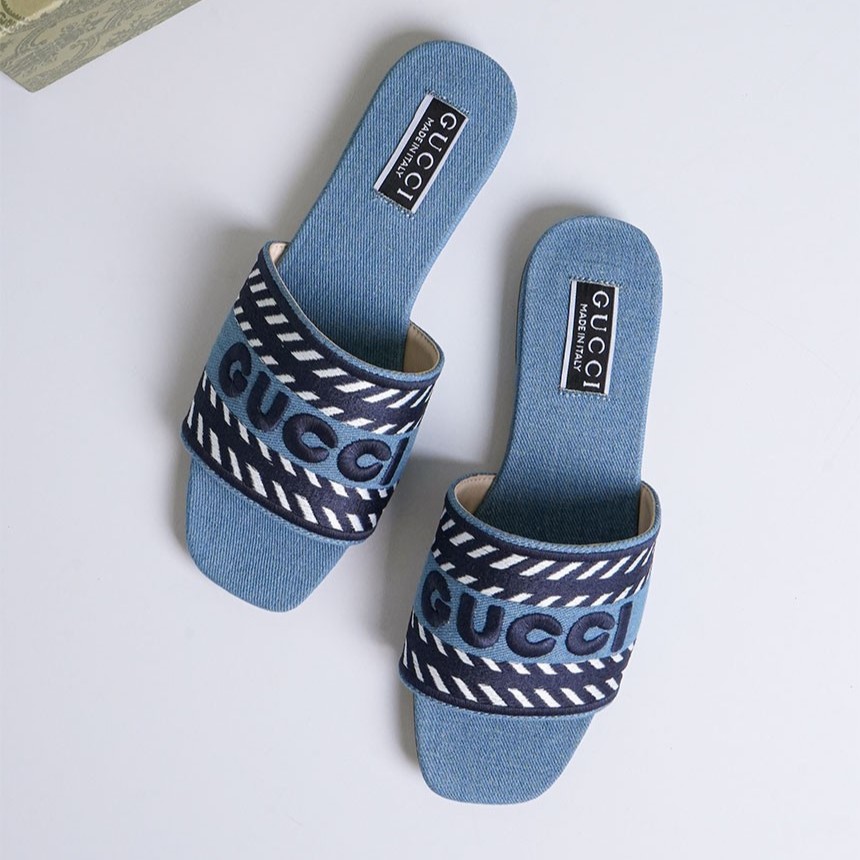 구찌 데님 스크립트 슬라이드 샌들